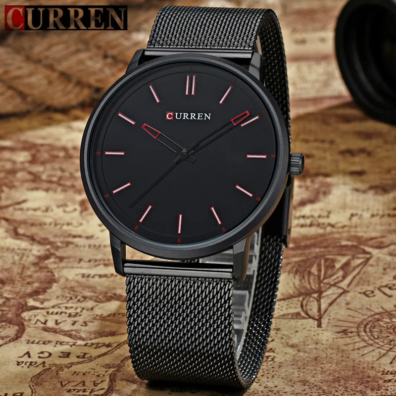 Goede Kopen Top Fashion Zwart Horloge CURREN Merk Horloges Mannen Roestvrij Stalen Mesh Band Quartz Horloge Dunne Dial Wrist Klok relogio masculino Goedkoop