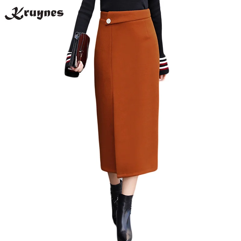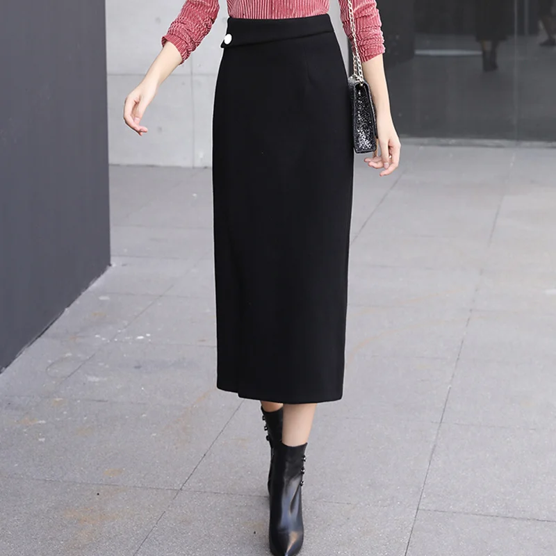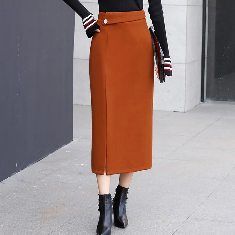 Goede Kopen Herfst Winter Wollen Lange Rokken Vrouwen Kokerrok Hoge Taille 2018 Vrouw Kantoor Mid Kalf Dikke Rok Jupe Vintage femme Goedkoop