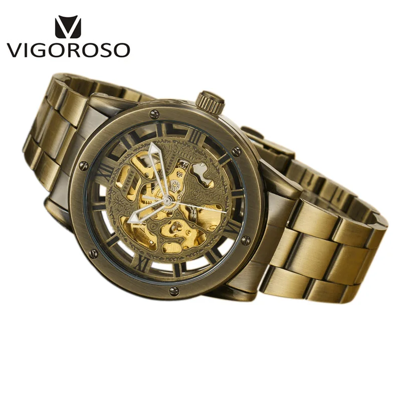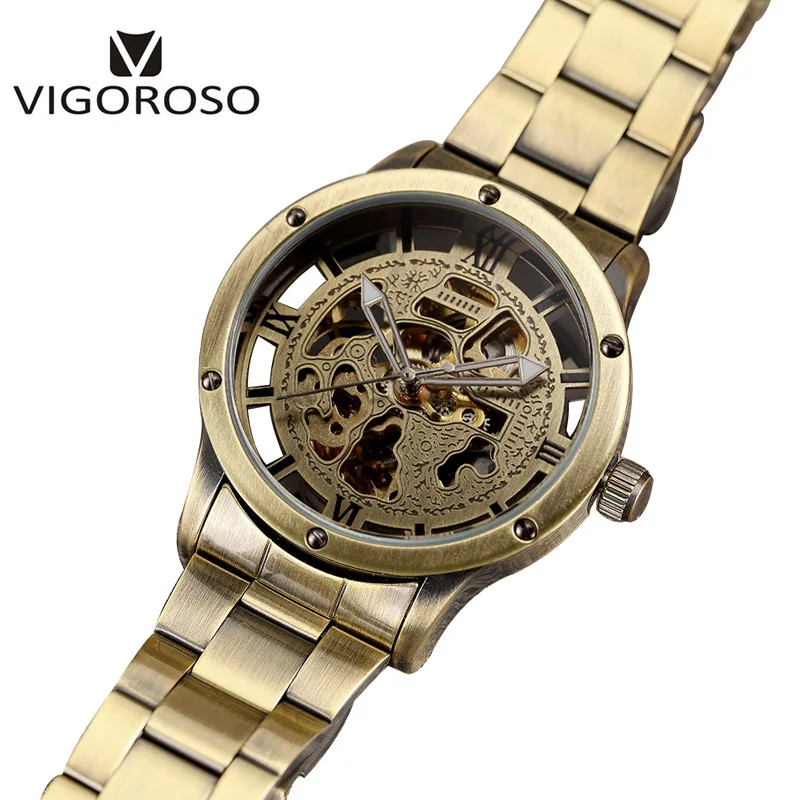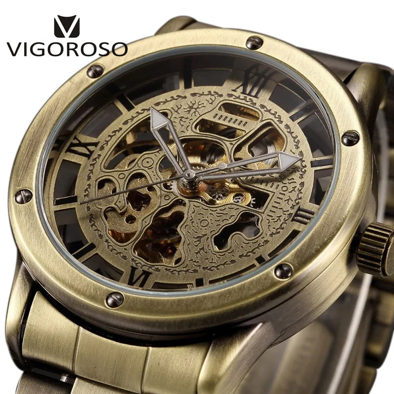 Beste Koop VIGOROSO Antieke Retro Vintage Steampunk Automatische Mechanische Skeleton Horloge Mannen Brons Staal Analoge Mens Zelf Widing Polshorloge Goedkoop.