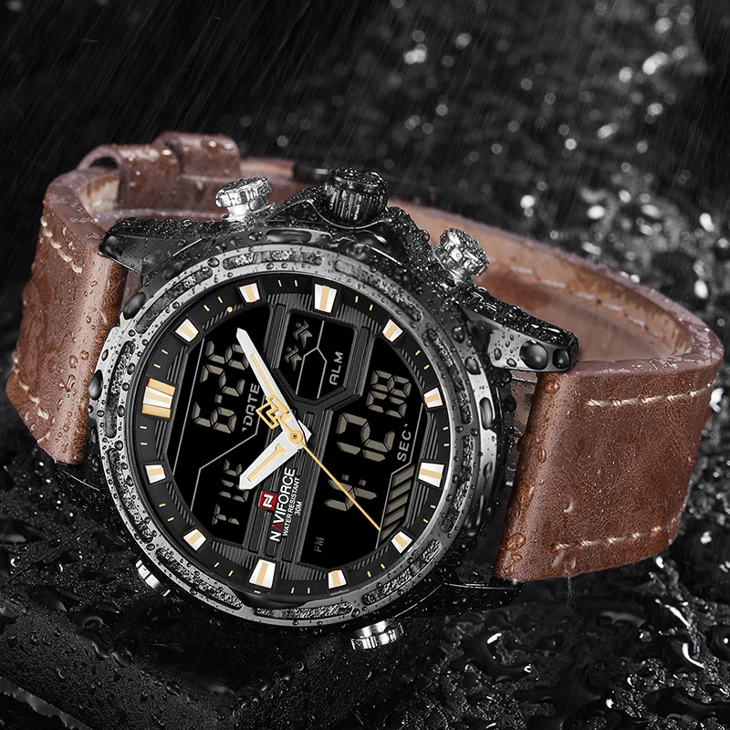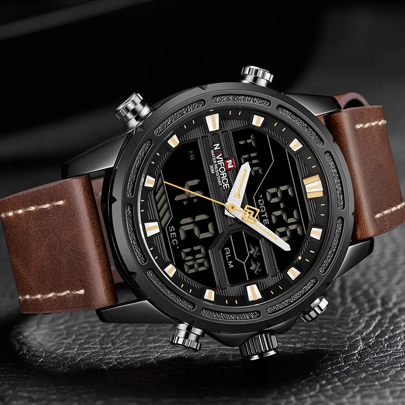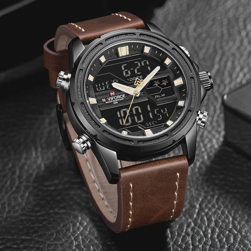 Goede Kopen Top Merk Mens Sport Horloges NAVIFORCE Mannen Quartz Analoge LED Klok Man Lederen Militaire Waterdicht Polshorloge Relogio Masculino Goedkoop