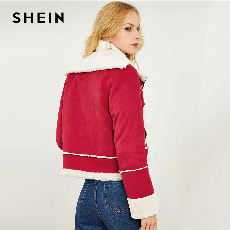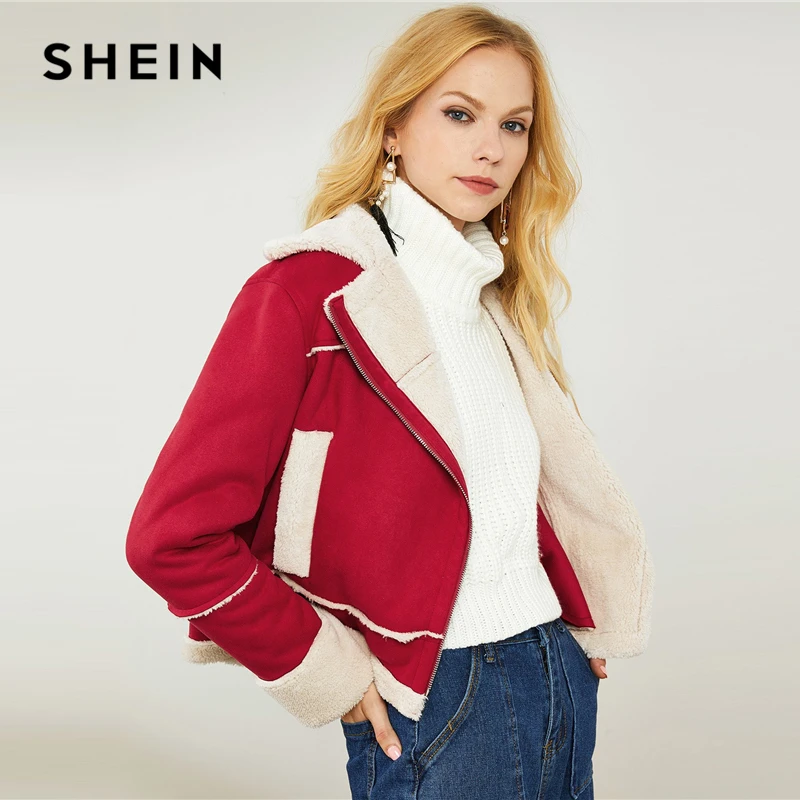 Kopen Goedkoop SHEIN Rode Highstreet Office Lady Notch Kraag Faux Fur Detail O Ring Zip Up Herfst Jas 2018 Winter Elegante jassen Bovenkleding Online
