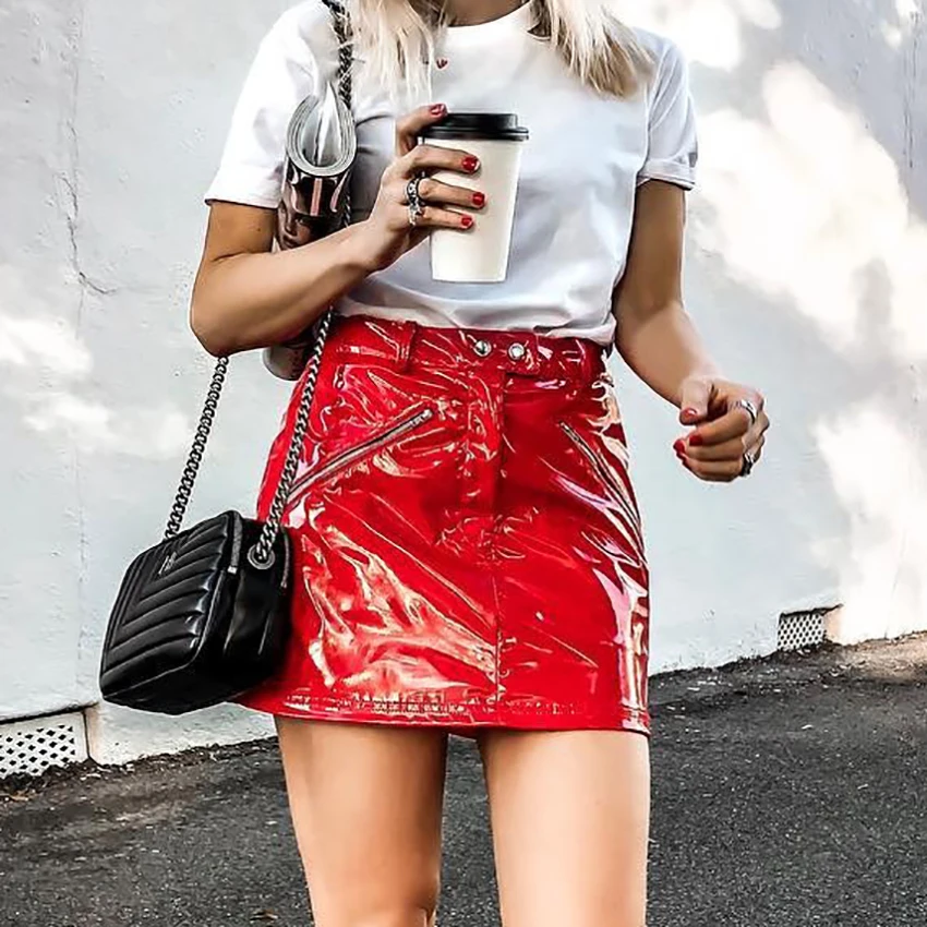 Goede Kopen OOTN Vrouwen Rood Potlood Rok PU Lederen Zomer Mini Rok Vrouwelijke Sexy Hoge Taille Dames Kantoor Rokken Korte 2018 Fashion kleding Goedkoop.
