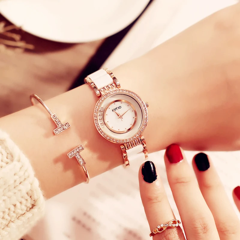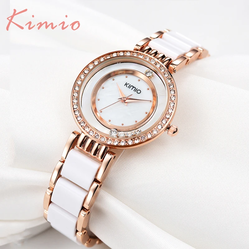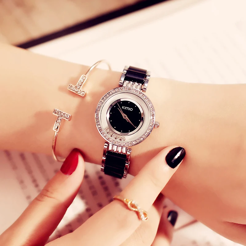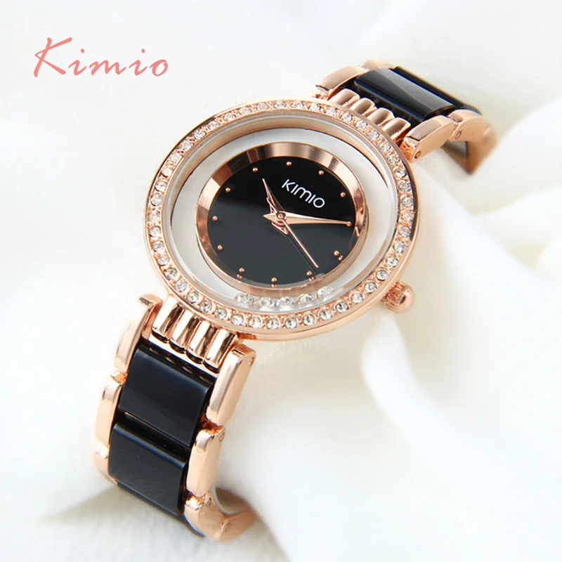 Goede Kopen Kimio ultra slim Top Merk Vrouw horloges Fashion Dames Crystal Klok Zwart Keramiek Goud Luxe Vrouwen Strass Diamant Horloge Goedkoop.