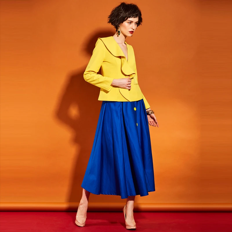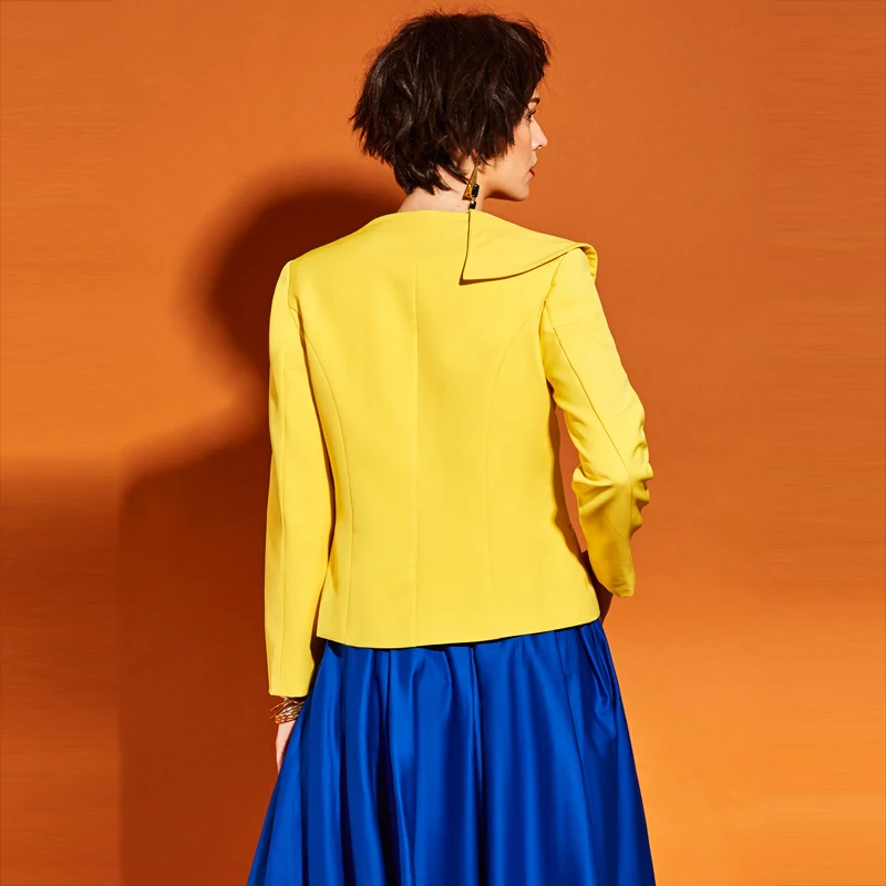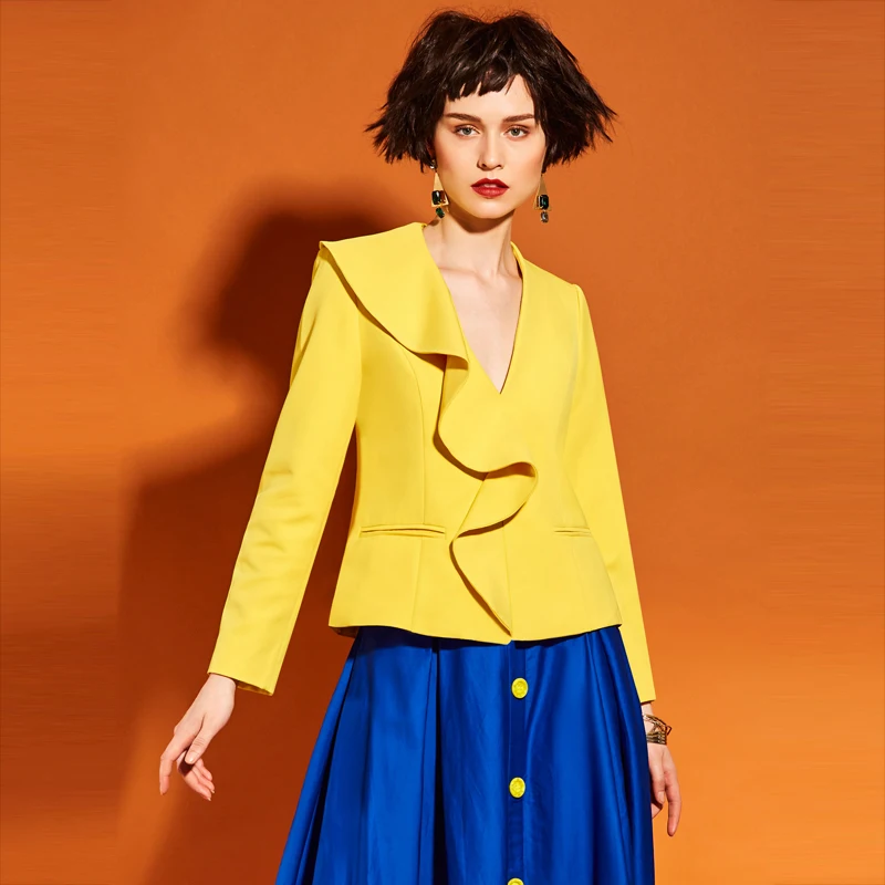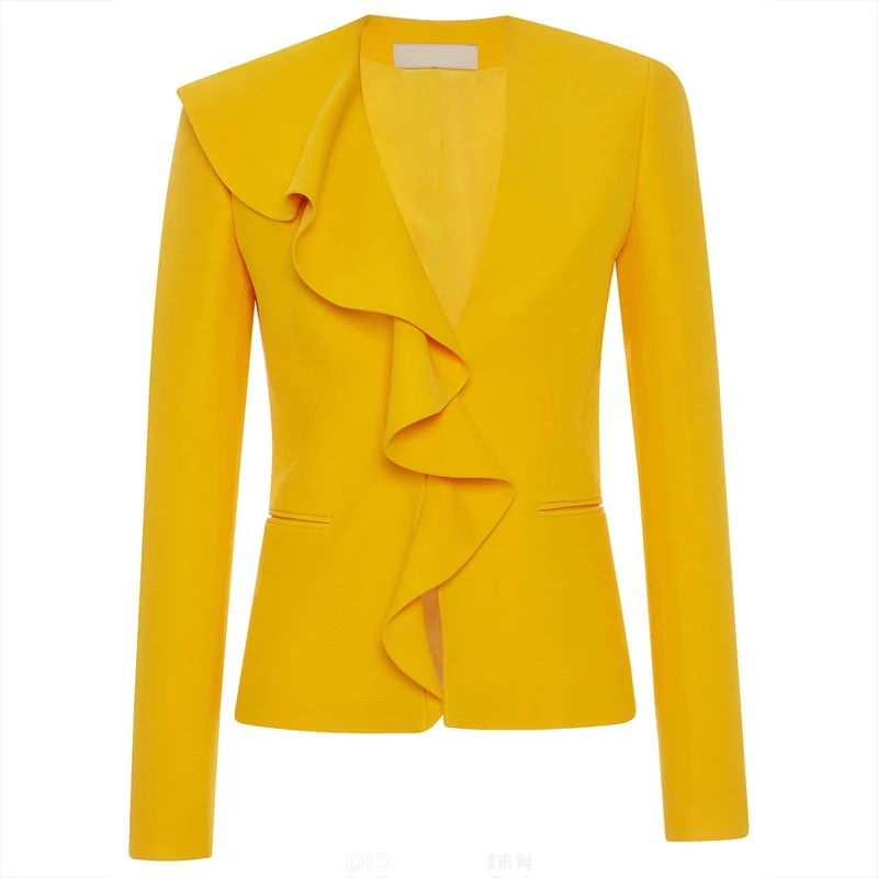 Beste Koop Vrouwen Kantoor Jas 2018 Herfst Geel V hals Casual Classic Werkkleding Ruche Pocket Verborgen Knop Jassen Lady Elegante Jas Goedkoop.