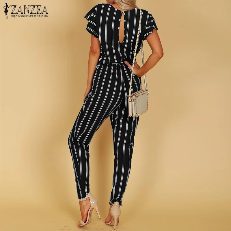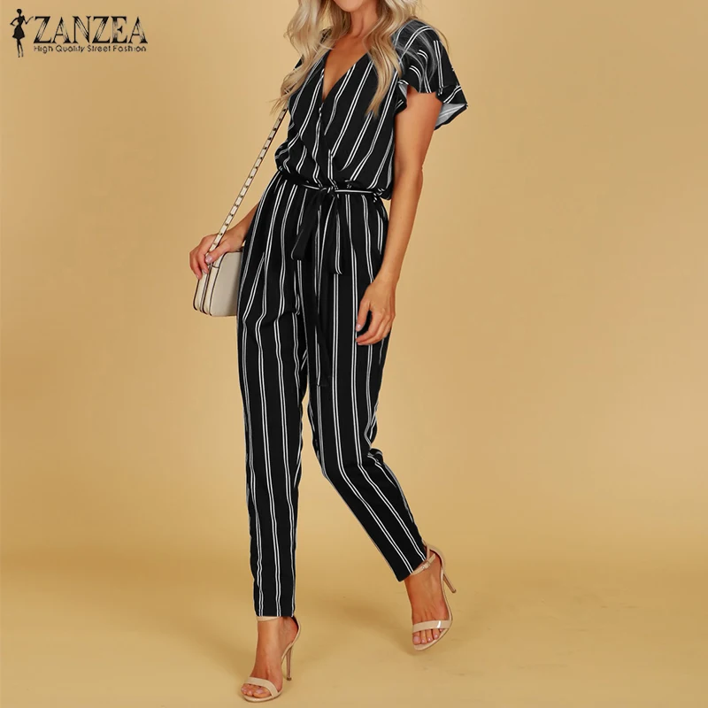 Beste Kopen ZANZEA 2018 Elegante Rompertjes Vrouwen Jumpsuit Vrouwelijke Gestreepte Broek Office Dames Bodysuits V hals Belted Zomer Broek Plus Size Goedkoop.