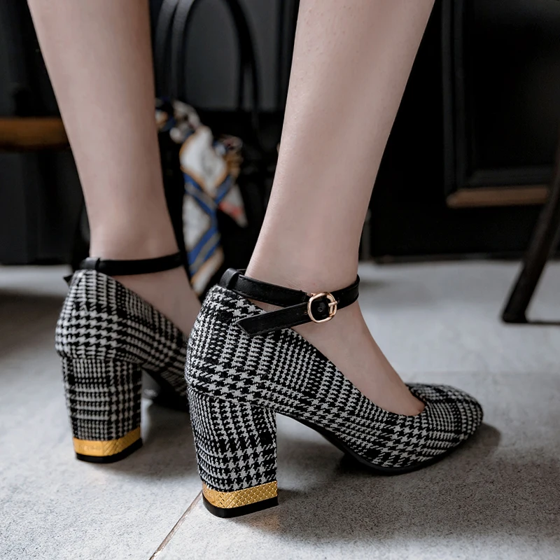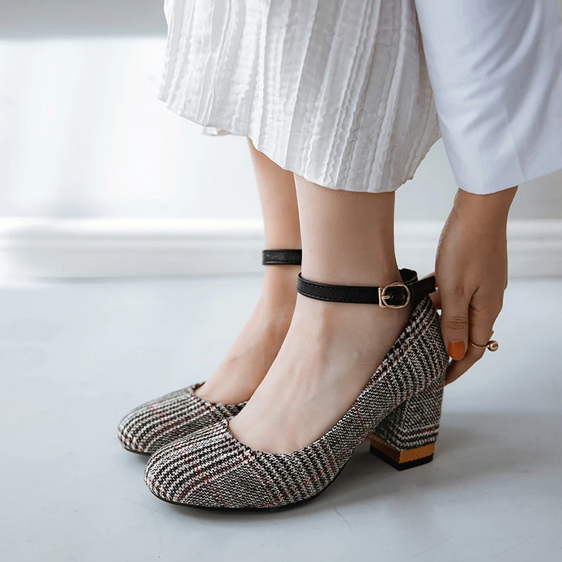 Beste Koop Plus Size 34 43 Vrouwen Pompen met Geblokte Vamp Retro Kantoor vrouwen Hoge Hakken Comfortabele Dragen 2018 NIEUWE Trend Schoenen Vrouw J01 Goedkoop